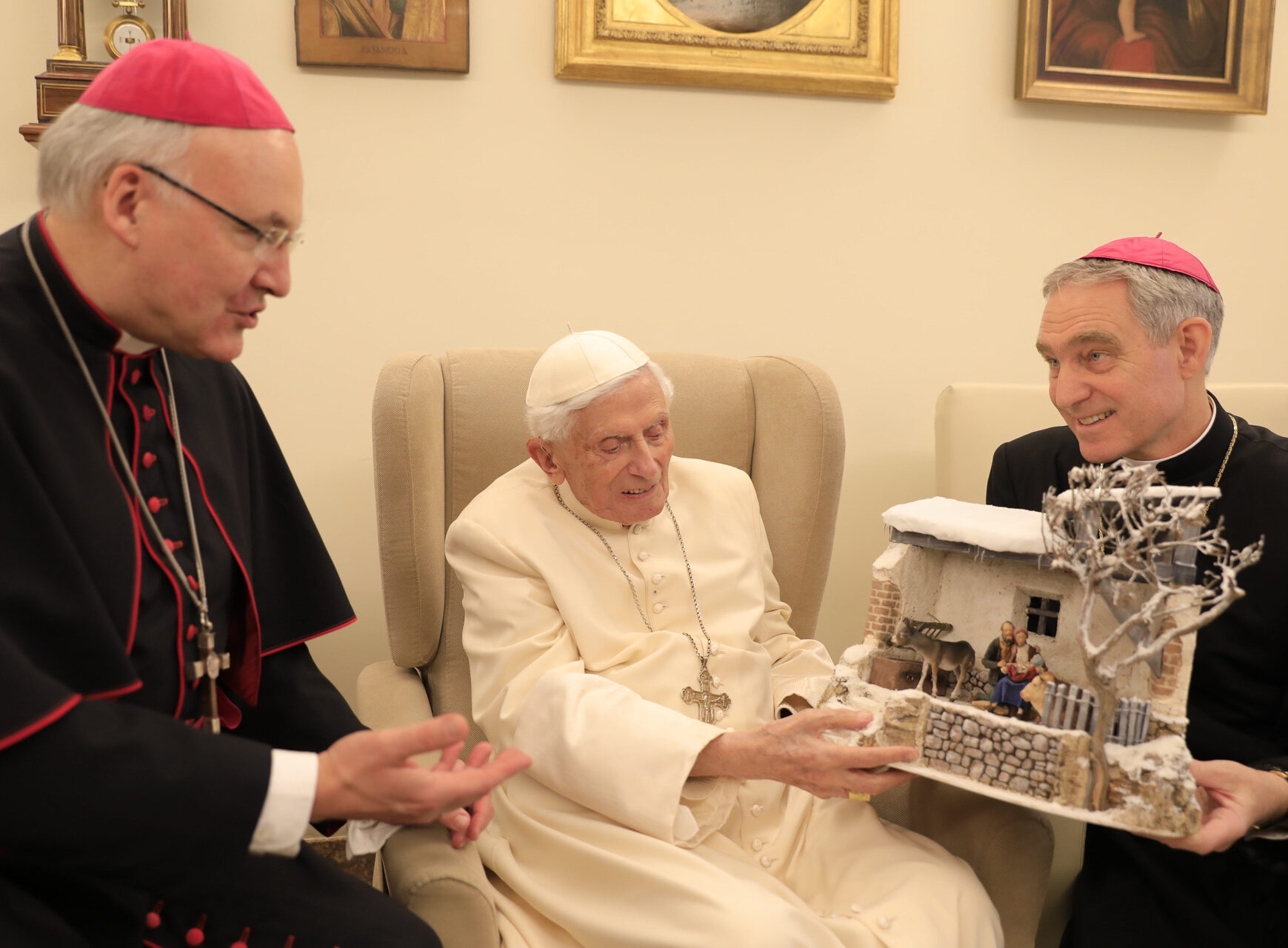 A great pleasure for the Association of the Friends of the Bavarian Crib to offer a crib, and an honor for Bishop Msgr. Rudolf Voderholzer to personally deliver the gift to the Pope Emeritus.